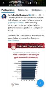 El estudio, basado en la percepción de 1.591 líderes de opinión de todo el país, destacó la gestión de Rey en materia de infraestructura, atención a emergencias viales y fortalecimiento de la seguridad, factores que han marcado la agenda del actual gobierno departamental.